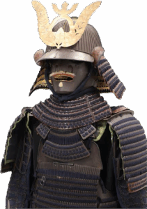 大久保藤=大久保家の家紋、登藤(のぼりふじ)に大をクワガタに開いた実際にある鎧兜をベースに、家紋を散らした戦支度(いくさじたく)を着せました。